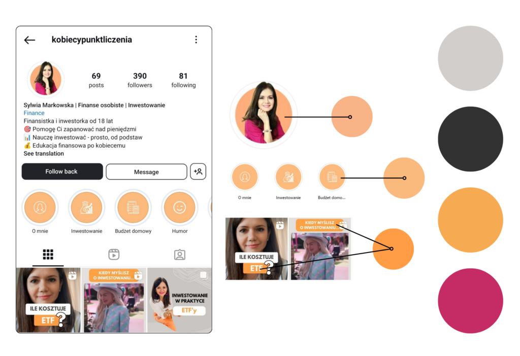 Sylwia prowadzi profil edukacyjny na Instagramie, gdzie dzieli się wiedzą o finansach osobistych. Choć regularnie publikowała treści, miała wrażenie, że jej profil nie wygląda wystarczająco profesjonalnie. Jej największe problemy to: