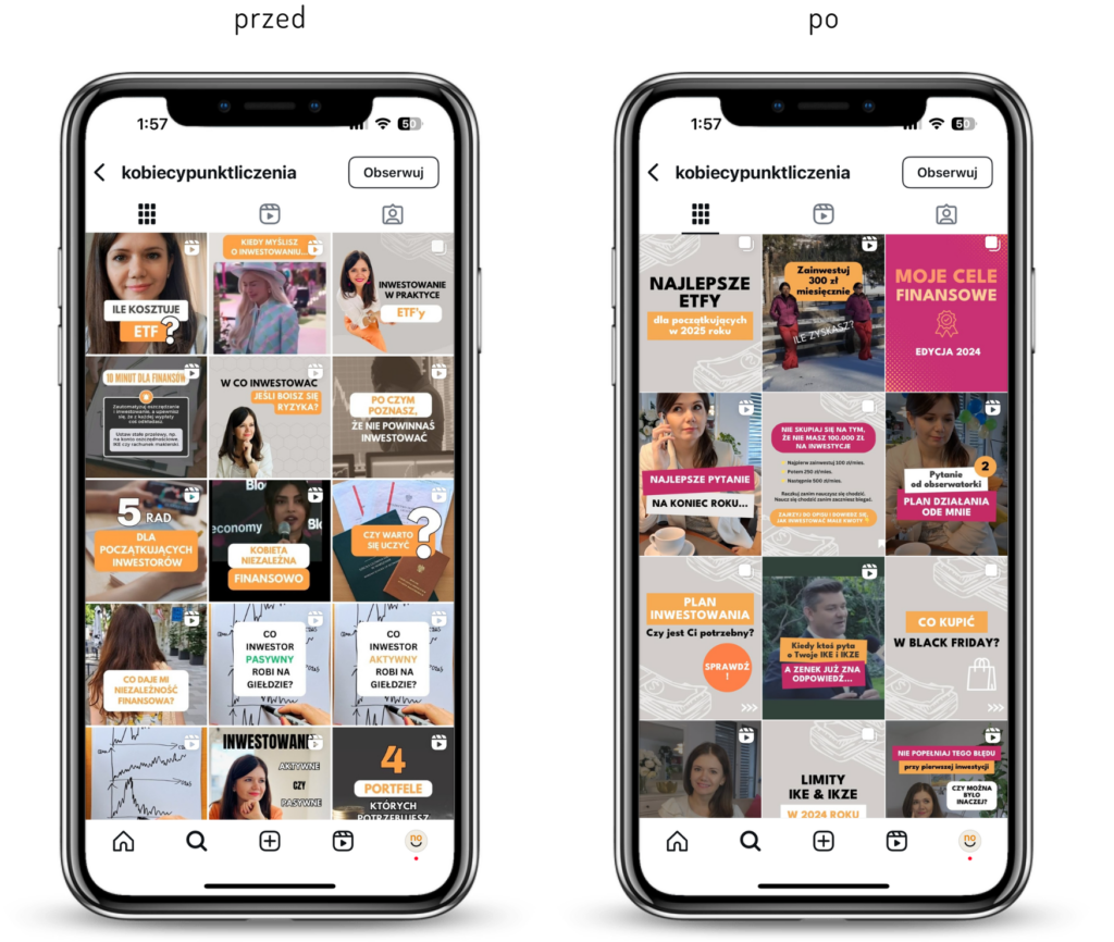Czy masz czasem wrażenie, że Twoje grafiki na Instagramie są niespójne, a profil nie wygląda tak, jakbyś tego chciał? Wiesz, że coś jest nie tak, ale nie potrafisz dokładnie określić, co? Z takim problemem zgłosiła się do nas Sylwia Markowska, właścicielka profilu na Instagramie @kobiecypunktliczenia. Postanowiła skorzystać z naszej usługi Kontroli Graficznej, aby nadać swoim postom profesjonalny wygląd i sprawić, że jej treści będą bardziej angażujące. Efekt? Spójność, czytelność i łatwiejsza praca nad kolejnymi postami.