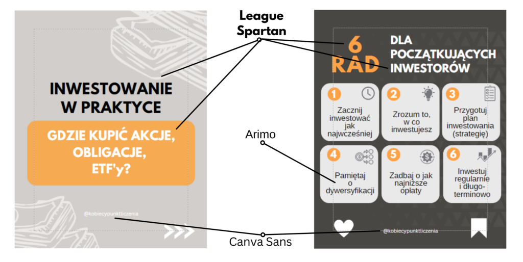 Zaproponowaliśmy Sylwii stałą paletę kolorów z dominującym pomarańczem i fuksją jako akcentem. Aby uniknąć zamieszania, wybraliśmy także jeden font – League Spartan – w dwóch wersjach (ExtraBold i Regular). To nadało spójności wszystkim grafikom.