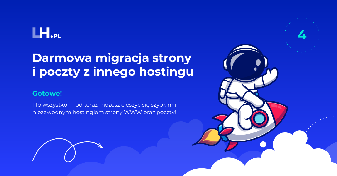 Nie ma problemu! Dzięki LH.pl możesz ZA DARMO przenieść swoją domenę, stronę i skrzynki mailowe do nowego hostingu, a dodatkowo skorzystać z naszego kodu rabatowego o wartości -20%! 💰 KOD: LH-noczesc